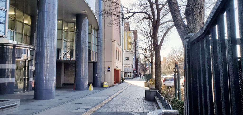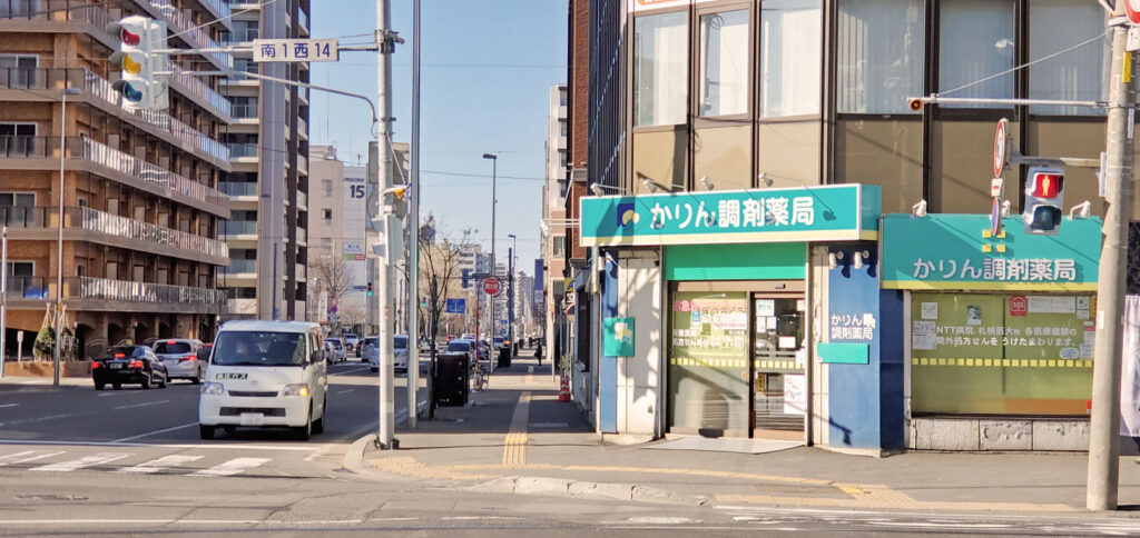 ①市電から降車されましたら、「かりん調剤薬局」さんの横の道を大通公園方面に進んでください。