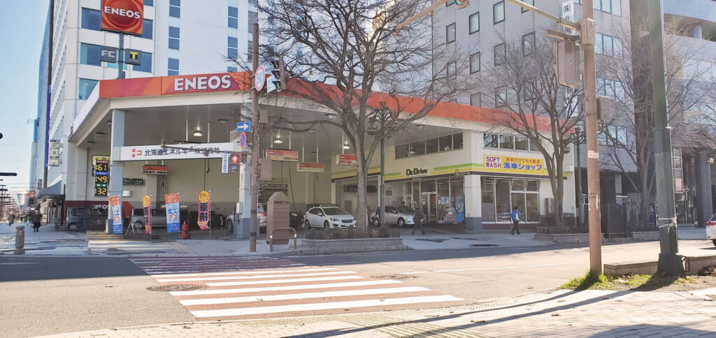 ②「1番出口」を出ましたら右手にガソリンスタンドが見えます。そちらに向かって、信号を渡ってください。